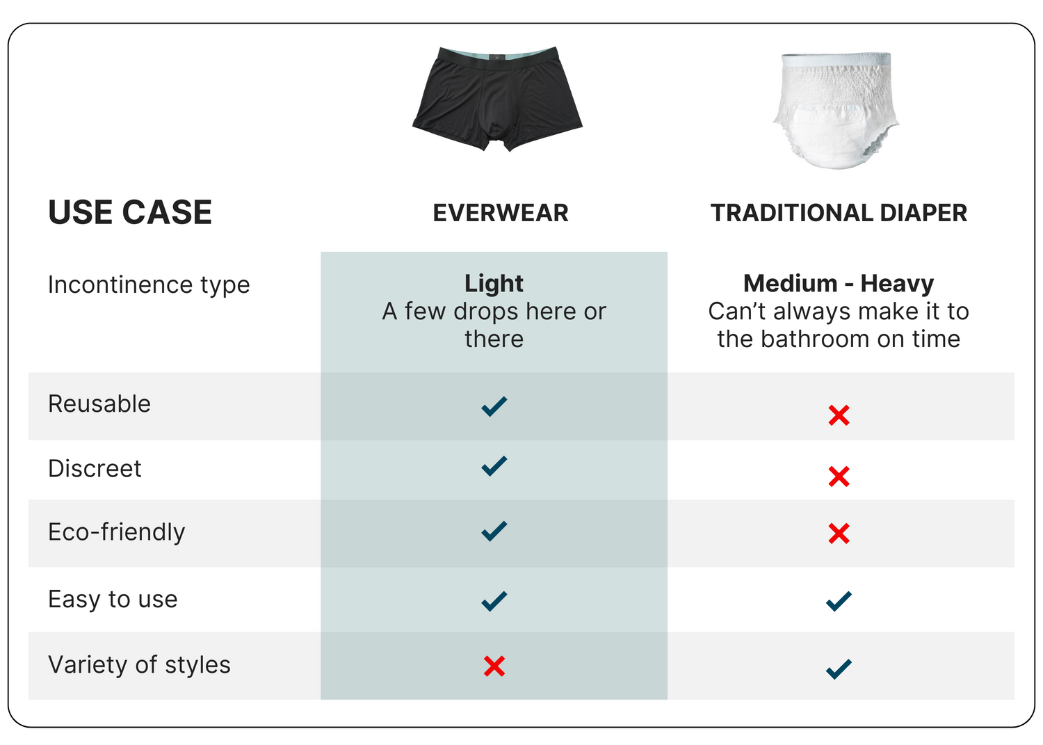Everwear is designed to be more discreet, comfortable, and better looking compared to traditional adult diapers, which can be bulkier, louder, and less breathable. Our underwear offers a more dignified and comfortable solution for managing light to moderate incontinence.