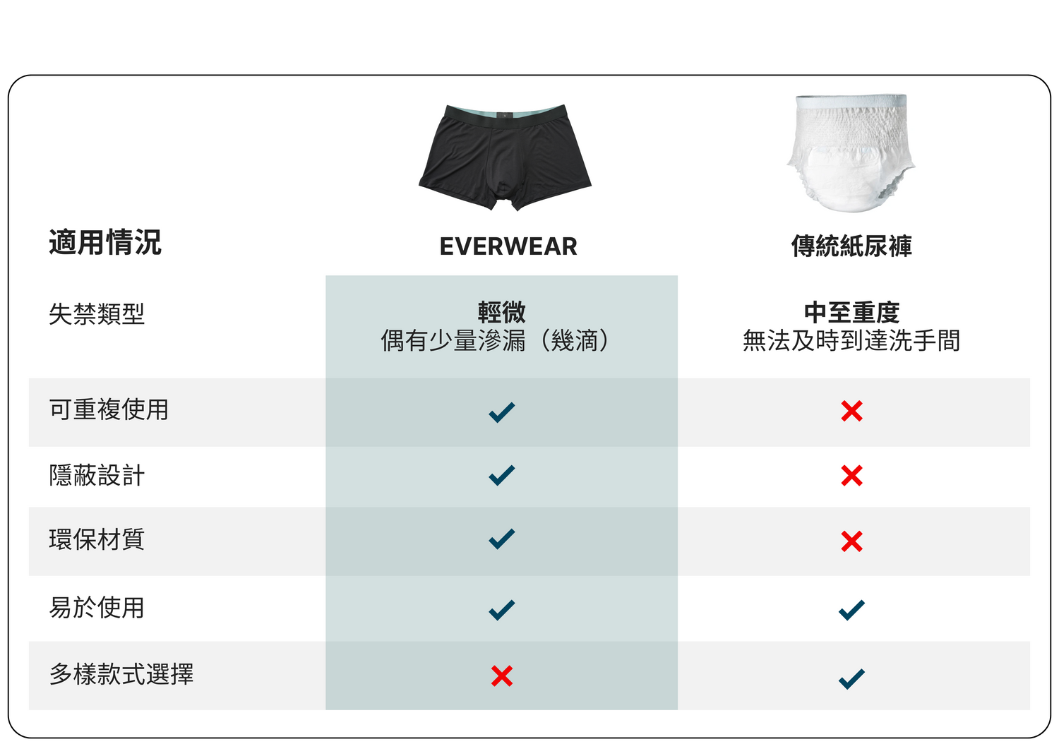 與傳統成人紙尿褲相比,Everwear 的設計更貼身舒適,外觀也更美觀。傳統成人紙尿褲體積較大、走動時聲響明顯,透氣性也較差。我們的內褲為輕度至中度失禁患者提供更舒適、更體貼的解決方案。
